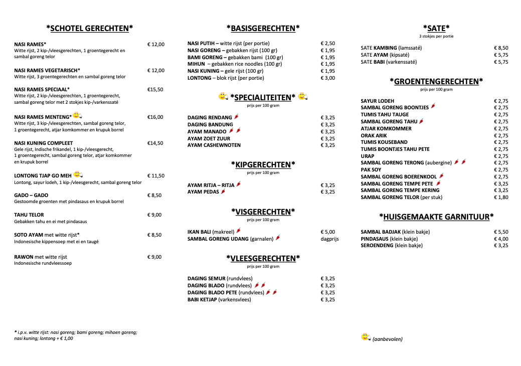 Zo zijn de gerechten op Sumatra in het algemeen veel pittiger dan op Java. De gerechten van Oost-Java zijn doorgaans wat zoeter van smaak. Daar wordt onder andere ook meer gebruikgemaakt van goela djawa, de Javaanse bruine suiker. Bekijk ons menu met smakelijke en traditionele gerechten en wees vooral niet bang om te vragen wat iets is, of om iets nieuws uit te proberen. Selamat makan – eet smakelijk!